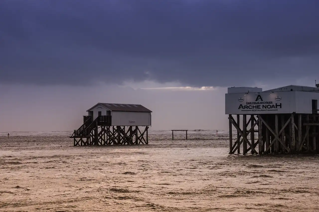 Einer der beliebtesten Urlaubsorte an Schleswig-Holsteins Westküste ist St. Peter Ording mit seinen Pfahlbauten am Strand.