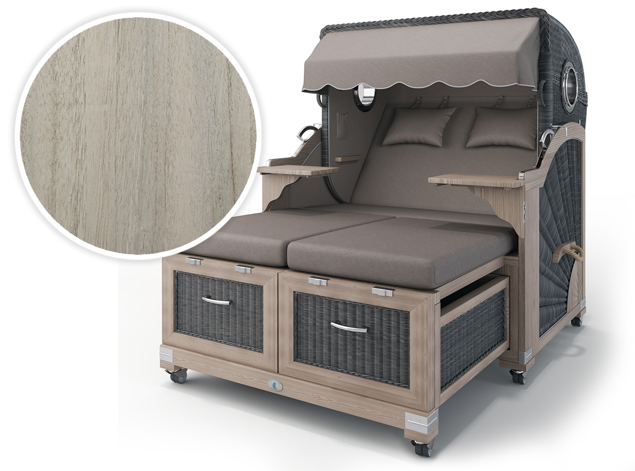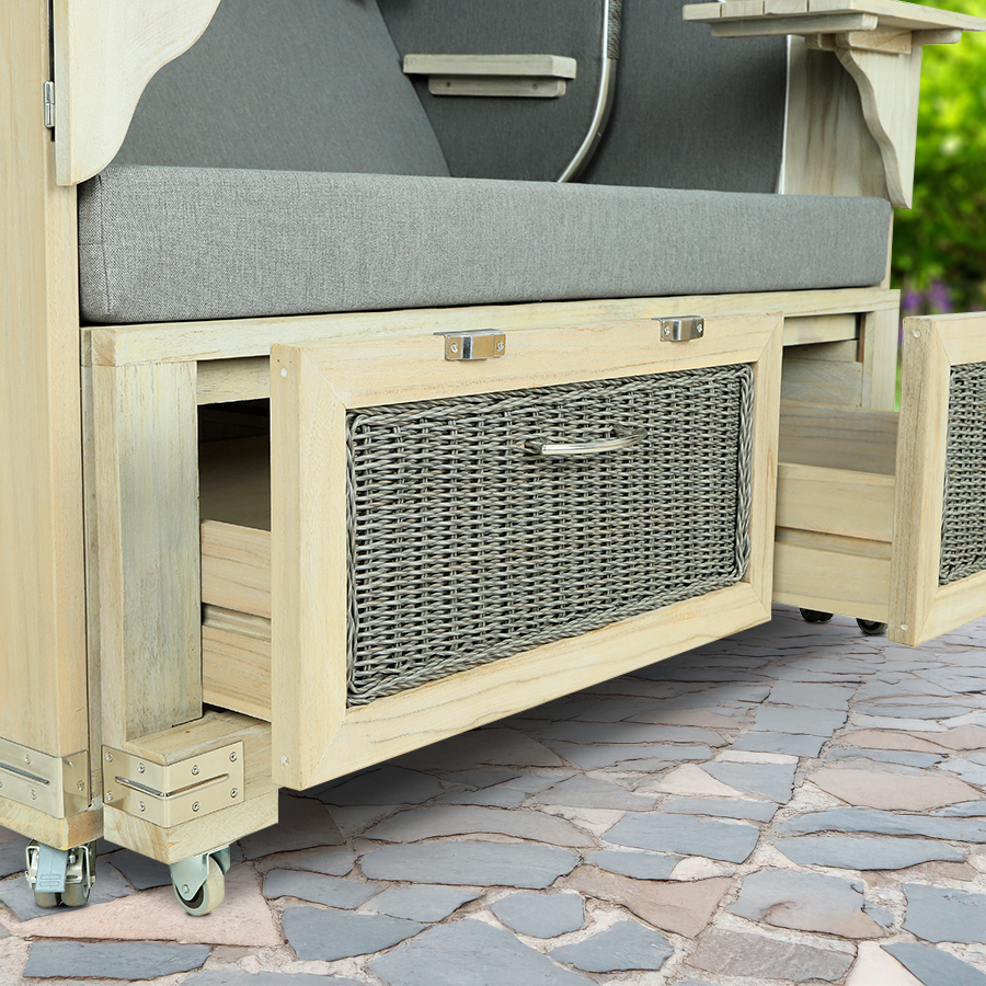 Wir setzen ausschließlich auf erstklassige Materialien: zertifiziertes, massives Edelholz, strapazierfähige Dralon-Stoffe, robustes PE-Geflecht und langlebige Edelstahlbeschläge. Unsere Strandkörbe entstehen in sorgfältiger Handarbeit, um Ihnen ein stilvolles und funktionales Produkt zu bieten, das jahrelang Freude bereitet. Qualität, auf die Sie sich verlassen können.